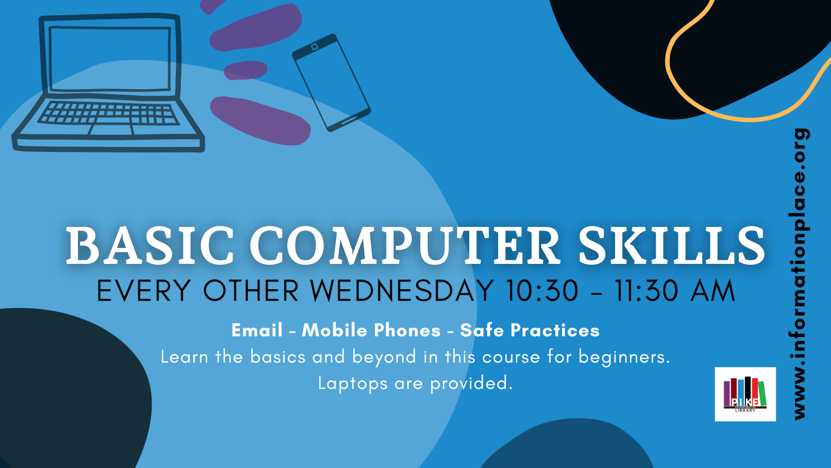Learn basic computer skills at the Pike County Public Library! Classes are offered every other Wednesday at 10:30 and will cover email, phones, tablets, tech lingo, resume and flyer creation, and more. Check the Events Page for more information.